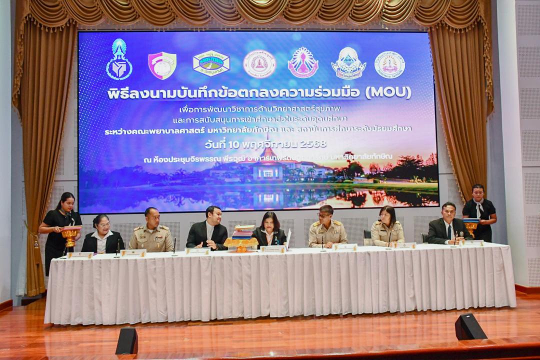 วันที่ 10 พฤศจิกายน 2568 คณะพยาบาลศาสตร์ มหาวิทยาลัยทักษิณ จัดพิธีลงนามข้อตกลงความร่วมมือทางวิชาการ (MOU) เพื่อพัฒนาความร่วมมือทางวิชาการด้านวิทยาศาสตร์สุขภาพ และสนับสนุนการเข้าศึกษาต่อในระดับอุดมศึกษา ร่วมกับสถาบันการศึกษาระดับมัธยมจำนวน 6 แห่ง ณ ห้องประชุมจิรพรรณ พีรวุฒิ อาคารเทพรัตน์วิทยารักษ์ คณะพยาบาลศาสตร์ มหาวิทยาลัยทักษิณ วิทยาเขตพัทลุง