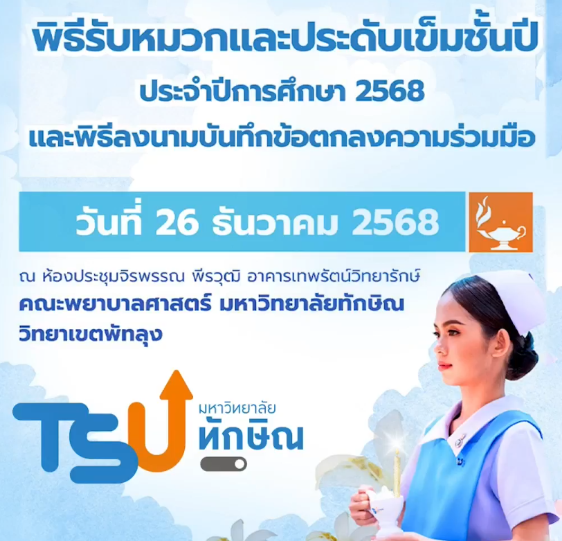 ก้าวแรกของเส้นทางพยาบาล เริ่มต้นจากหมวกพยาบาลใบแรก มหาวิทยาลัยทักษิณจัดพิธีรับหมวกพยาบาล ปลูกฝังจิตวิญญาณแห่งการดูแล ในก้าวสำคัญของการเริ่มต้นวิชาชีพผู้ดูแล